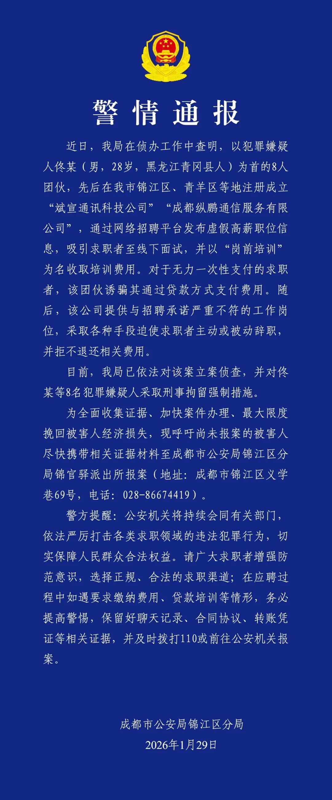 开户网站 一团伙通过发布虚假高薪职位信息收取培训费、诱骗贷款,成都警方:8人被采取刑事拘留强制措施